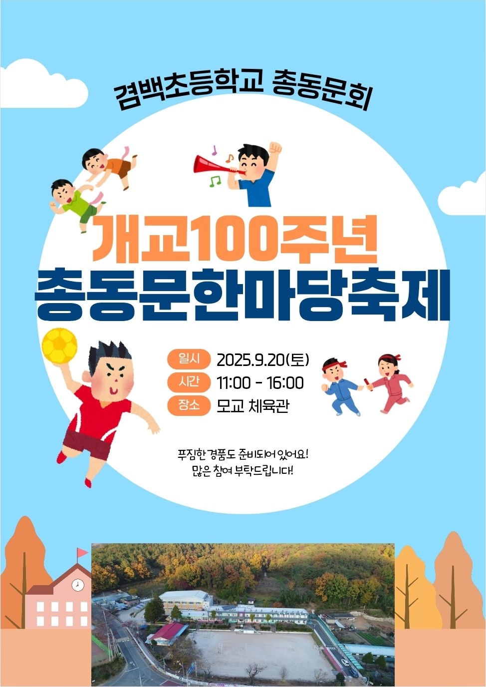 [이벤트 뉴스] 이벤트 뉴스 기자 – 2025년 9월 20일 – 유서 깊은 겸백초등학교가 마침내 개교 100주년을 맞는다. 오는 9월 20일, 모교 체육관에서는 ‘개교 100주년 기념 및 총동문 한마당 축제’가 성대하게…