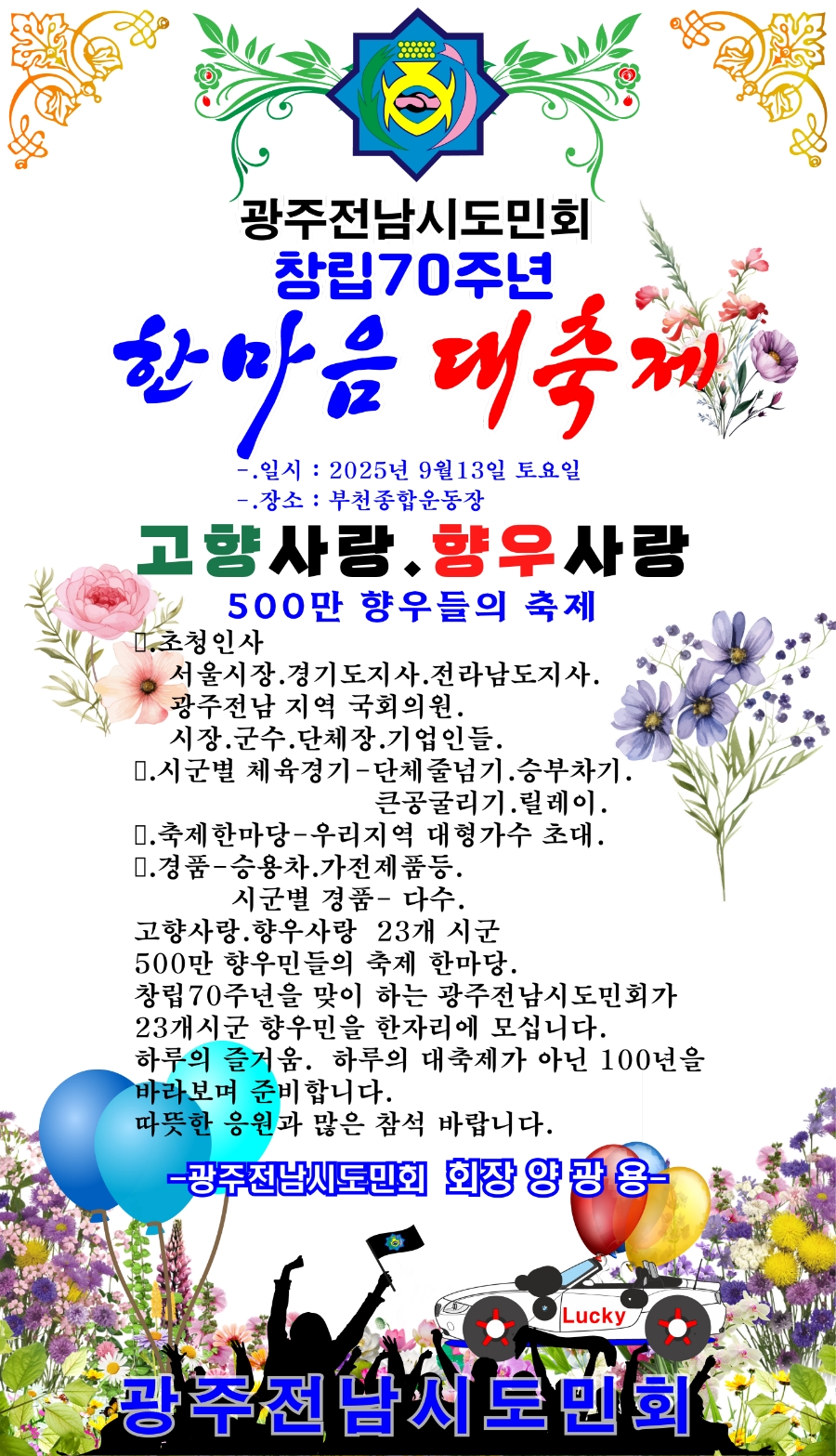 광주·전남 출신 향우들의 화합과 자긍심을 다지는 광주전남시도민회 창립 70주년 한마음대축제가 오는 9월 13일(토), 부천종합체육관에서 열린다. 이번 대축제에는 재경 23개 시·군 향우와 가족들을 비롯해 광주·전남 출신 국회의원, 자치단체장, 지역 인사들이 대거…
